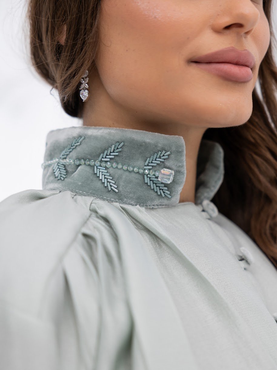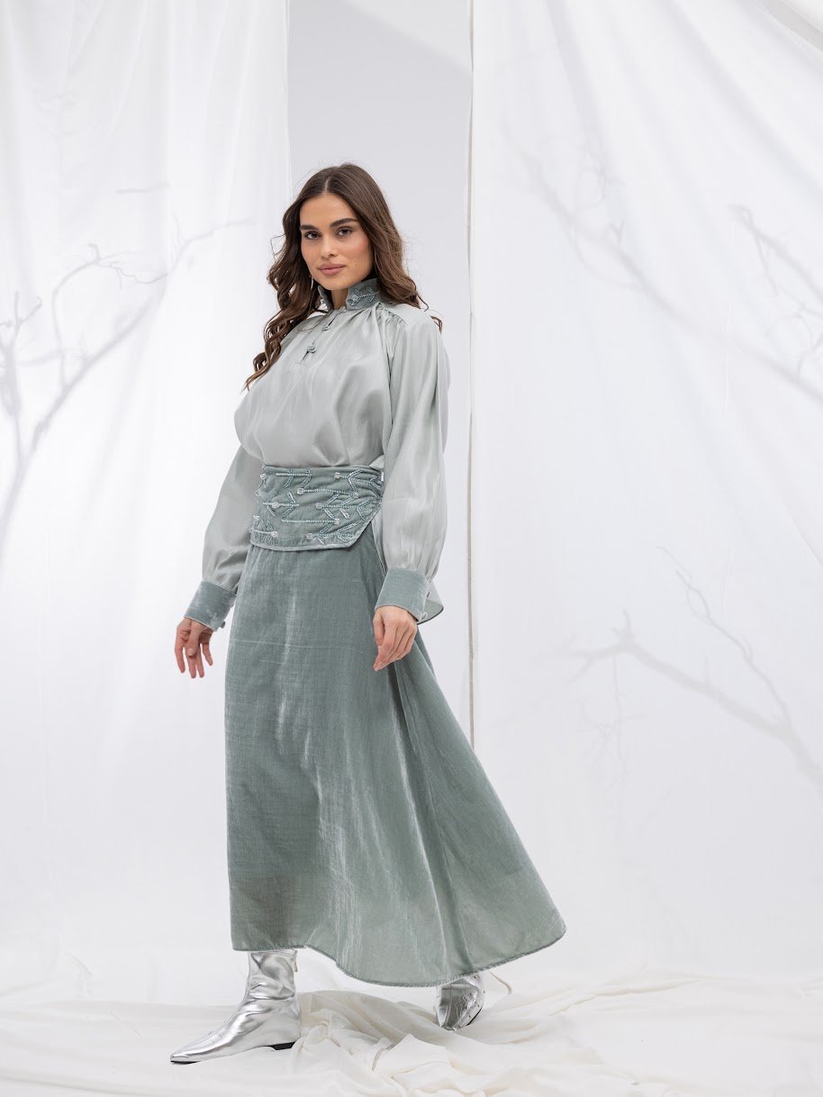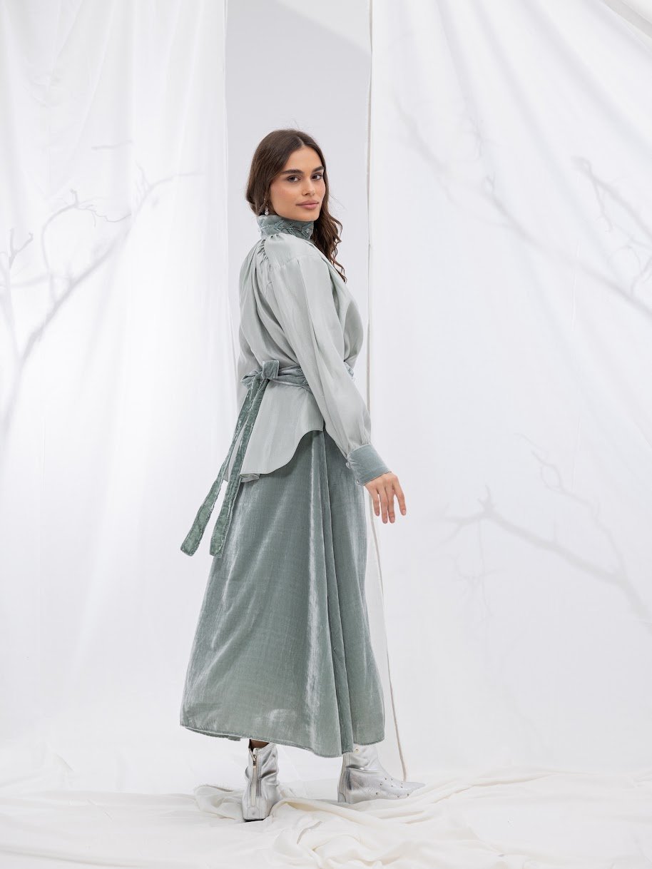 التنوره حرير مخمل و القميص لينن ممكن لبسه داخل التنوره او خارجها حسب الذوق والتنسيق المناسب